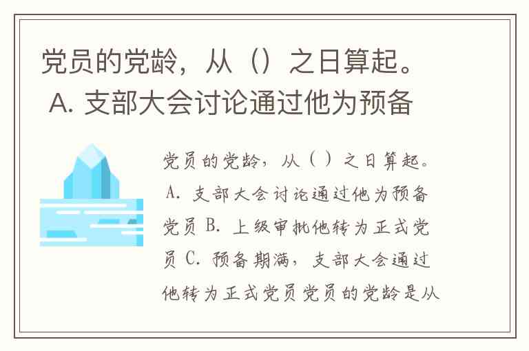 党员的党龄是从 C. 预备期满,支部大会通过他转为正式党员 之日起算起。