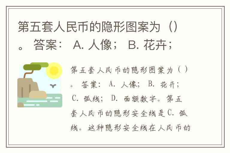 第五套人民币的隐形图案为()。 答案: A. 人像; B. 花卉; C. 弧线; D. 面额数字。