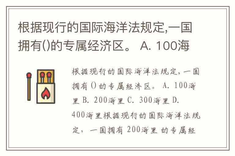 根据现行的国际海洋法规定,一国拥有()的专属经济区。 A. 100海里 B. 200海里 C. 300海里 D. 400海里