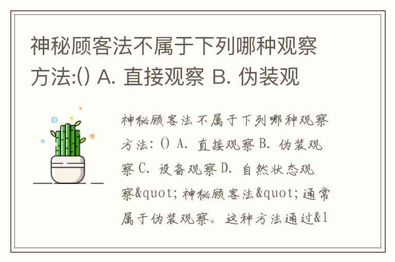 神秘顾客法不属于下列哪种观察方法:() A. 直接观察 B. 伪装观察 C. 设备观察 D. 自然状态观察