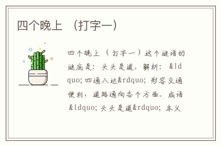 “四个晚上”:在汉语中,“晚上”可以用“夕”字来表示(如“除夕”即除旧迎新之夜)。因此,“四个晚上”就是 四个“夕”字。