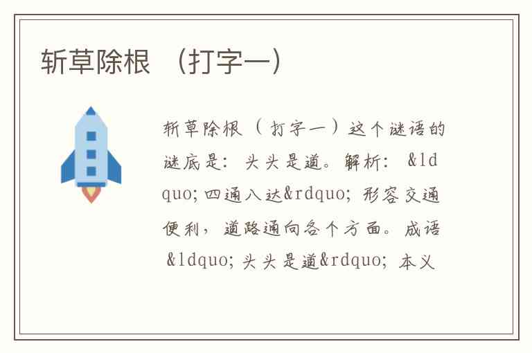 “斩草”:“草”在字谜中通常由“艹”(草字头)来表示。“斩草”意味着要将“艹”去掉或“斩除”。