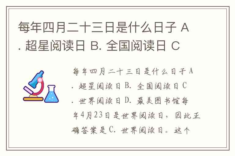 每年四月二十三日是什么日子 A. 超星阅读日 B. 全国阅读日 C. 世界阅读日 D. 最美图书馆