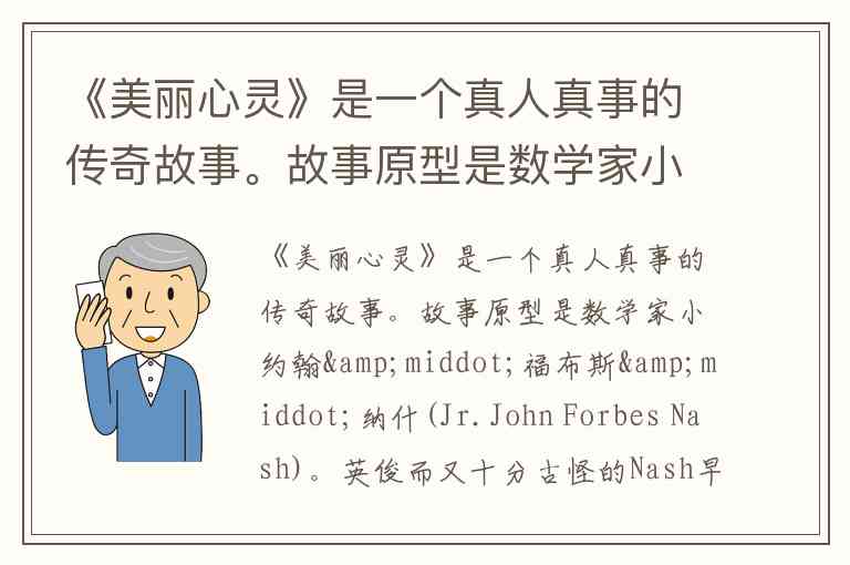 《美丽心灵》确实是基于数学家约翰·纳什的真实故事改编的。纳什是一位非常杰出的数学家,尤其因其在博弈论方面的贡献而闻名。尽管他在事业初期表现出色,但不幸的是,他在年轻时患上了精神分裂症,这给他的生活和事业带来了巨大的挑战。尽管如此,他在妻子艾丽西亚的支持下,最终克服了这一困境,并于1994年获得了诺贝尔经济学奖。