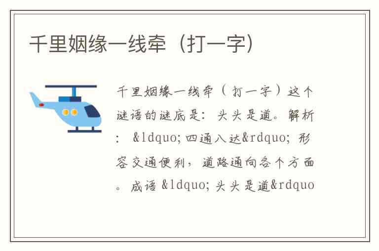 “姻缘一线牵”:这部分是提示和修饰,形象地说明了“千里”是如何被连接起来的,暗示“千”和“里”由一条线(即笔画)紧密地牵引、结合为一体,从而形成一个完整的字。
