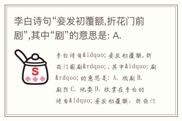 李白诗句“妾发初覆额,折花门前剧”,其中“剧”的意思是: A. 戏剧 B. 剧烈 C. 玩耍 D. 欣赏