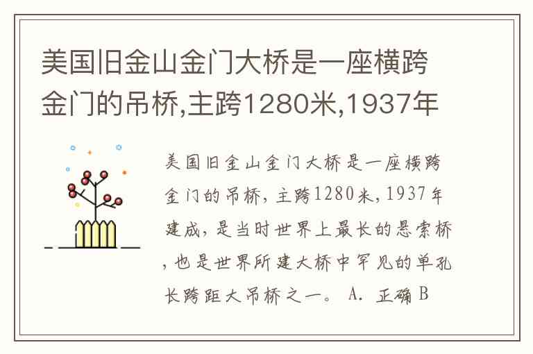 美国旧金山金门大桥是一座横跨金门的吊桥,主跨1280米,1937年建成,是当时世界上最长的悬索桥,也是世界所建大桥中罕见的单孔长跨距大吊桥之一。 A. 正确 B. 错误