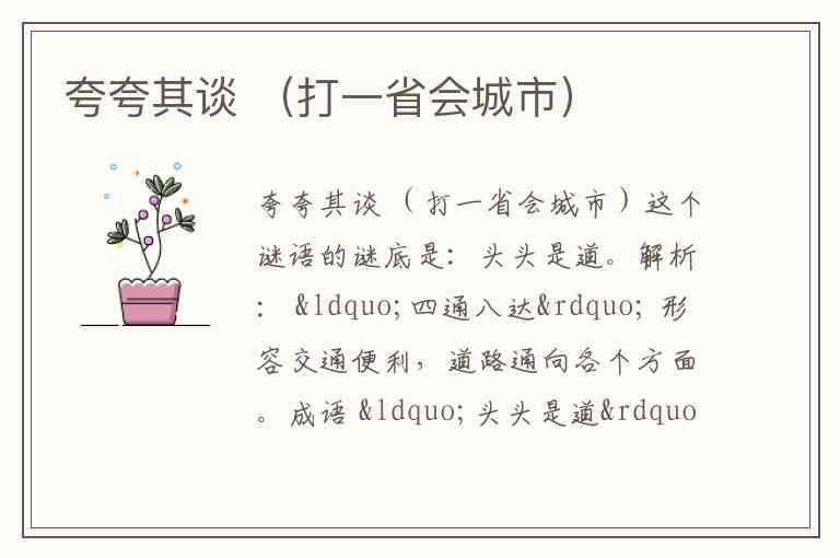 因此,谜面通过引导人们从“夸夸其谈”联想到“夸海口”,从而巧妙地指向了海南省省会城市海口。