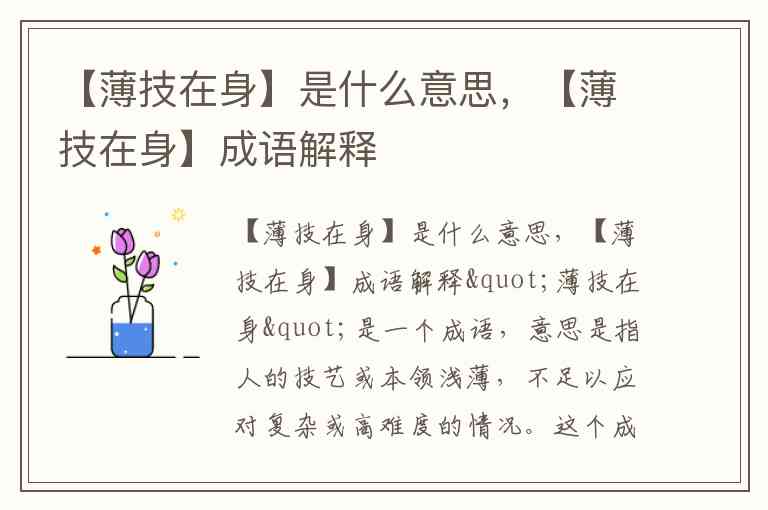 "薄技在身"是一个成语,意思是指人的技艺或本领浅薄,不足以应对复杂或高难度的情况。这个成语形容一个人的能力或技能不深厚,可能只是一些基础的技能,无法应对更高层次的挑战。