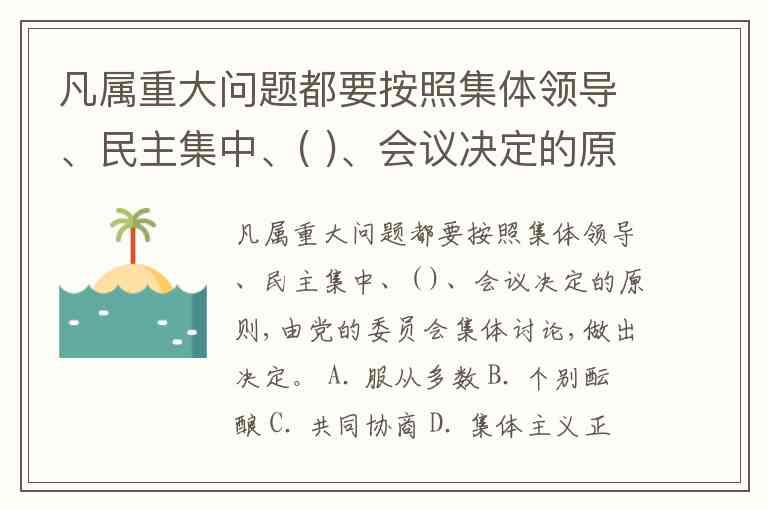 凡属重大问题都要按照集体领导、民主集中、( )、会议决定的原则,由党的委员会集体讨论,做出决定。 A. 服从多数 B. 个别酝酿 C. 共同协商 D. 集体主义