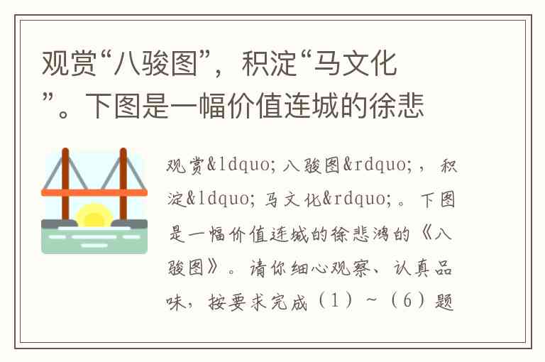 观赏“八骏图”,积淀“马文化”。下图是一幅价值连城的徐悲鸿的《八骏图》。请你细心观察、认真品味,按要求完成(1)~(6)题。 (1)从画面的构图、意蕴及象征意义方面,为展览馆的解说员写一段解说词。____________________________________________________(2)请你认真探究“马”字的演变图示,根据要求写出探究结论。 ①从汉字的起源看:__________________________________②从汉字的发展看:__________________________________(3)请你将自己积累的有关“马”的俗语、传说,各写出两个来。有关马的俗语:①_______________________________________,②_______________________________________。有关马的传说:①_______________________________________。②_______________________________________。(4)你读过的名著中一定有涉及马的故事,请写出两部名著中的马的名称。在《__________》作品中,有_________马;在《__________》作品中,有_________马。(5)农历牛年春节,有人根据徐悲鸿的《八骏图》写了副上联,请你对出下联。上联:骏马金鞍跨上康庄路下联:__________________(6)过去不论在生活中,还是战场上,马都发挥过不可替代的作用。但随着科技的进步,马的作用大大不及从前。由此,人们对马的作用展开辩论。请针对甲方的观点,从相反的角度述说你的观点。 甲方观点:随着生产力的发展、科技水平的提高,汽车、飞机取代了马匹成为快捷便利的交通工具和运输工具。马在现代生活中所起的作用越来越小,可以说,马这种动物的历史使命已经完成了,所以最终可以为人冷落、遗忘直至消亡。你的观点:__________________________________