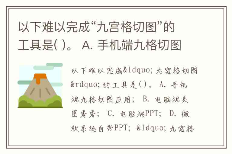 以下难以完成“九宫格切图”的工具是( )。 A. 手机端九格切图应用; B. 电脑端美图秀秀; C. 电脑端PPT; D. 微软系统自带PPT;