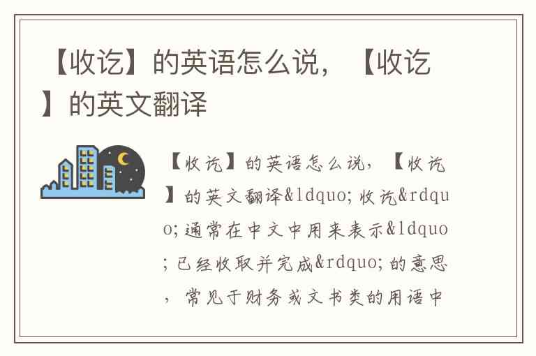 “收讫”通常在中文中用来表示“已经收取并完成”的意思,常见于财务或文书类的用语中。根据上下文,它的英文翻译可以有几种表达方式,常见的有: