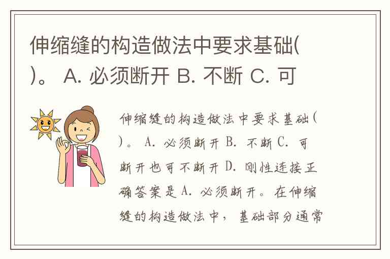 伸缩缝的构造做法中要求基础( )。 A. 必须断开 B. 不断 C. 可断开也可不断开 D. 刚性连接