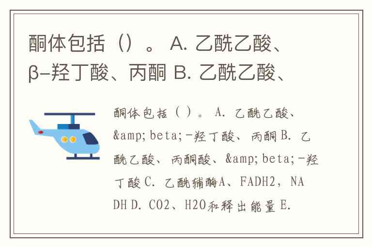 酮体包括()。 A. 乙酰乙酸、β-羟丁酸、丙酮 B. 乙酰乙酸、丙酮酸、β-羟丁酸 C. 乙酰辅酶A、FADH2,NADH D. CO2、H2O和释出能量 E. 乙酰辅酶A、NADPH、CO2