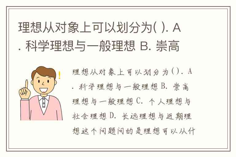 理想从对象上可以划分为( ). A. 科学理想与一般理想 B. 崇高理想与一般理想 C. 个人理想与社会理想 D. 长远理想与近期理想
