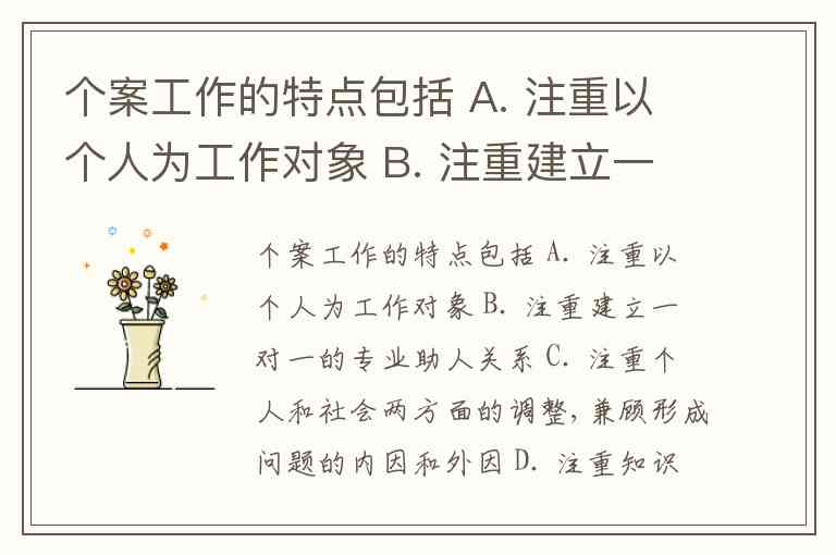D. 注重知识基础:个案工作要求工作者具备扎实的专业知识基础,包括心理学、社会学、教育学等方面的知识,以便提供科学、合理的帮助。