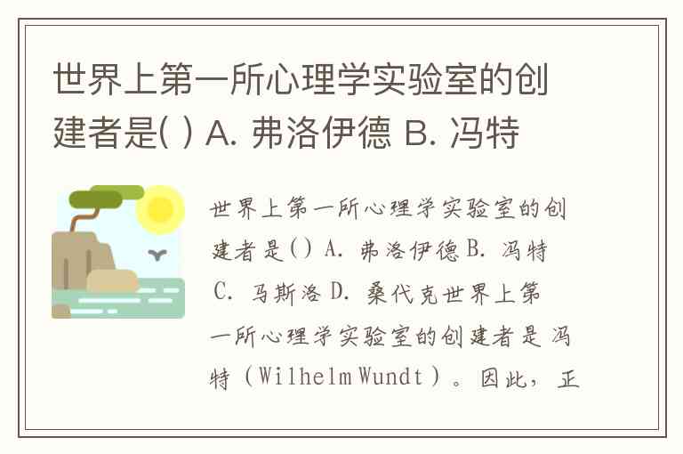 世界上第一所心理学实验室的创建者是( ) A. 弗洛伊德 B. 冯特 C. 马斯洛 D. 桑代克
