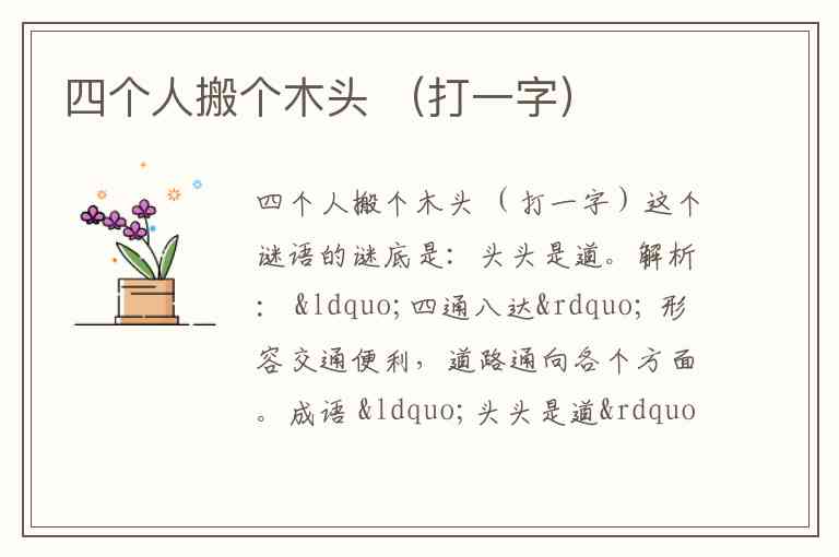 根据谜面“四个人搬个木头”,谜底是 杰。
