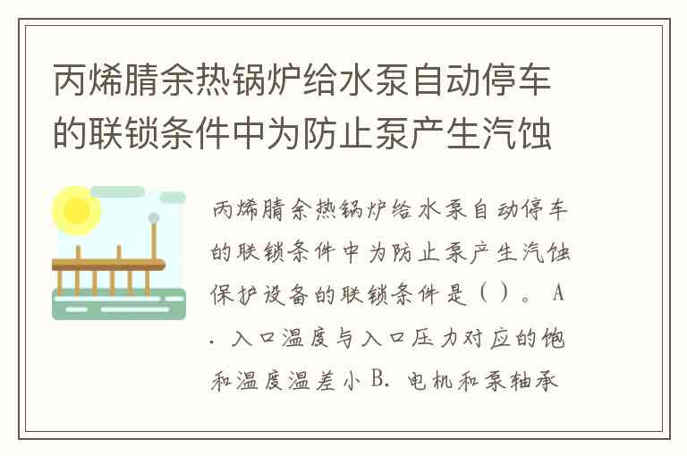 丙烯腈余热锅炉给水泵自动停车的联锁条件中为防止泵产生汽蚀保护设备的联锁条件是()。 A. 入口温度与入口压力对应的饱和温度温差小 B. 电机和泵轴承温度高 C. 泵入口管线压力降大 D. 除氧器液位低