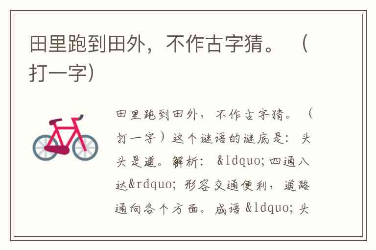 “不作古字猜”:这是一句重要的提示,排除了一个常见的干扰答案“古”字。因为如果把“十”放在“田”的上面或下面,可能会形成“古”字(“十”在上,“口”在下,但“田”不是“口”),所以谜面特意说明不要往这个方向猜。