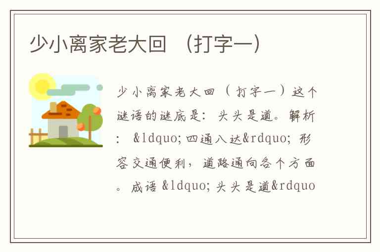“少小离家”:这里的“少小”指的是“少”字缺少一部分,即“少”字“离家”——去掉一部分。将“少”字下面的“撇(丿)”离开,剩下的是“小”。