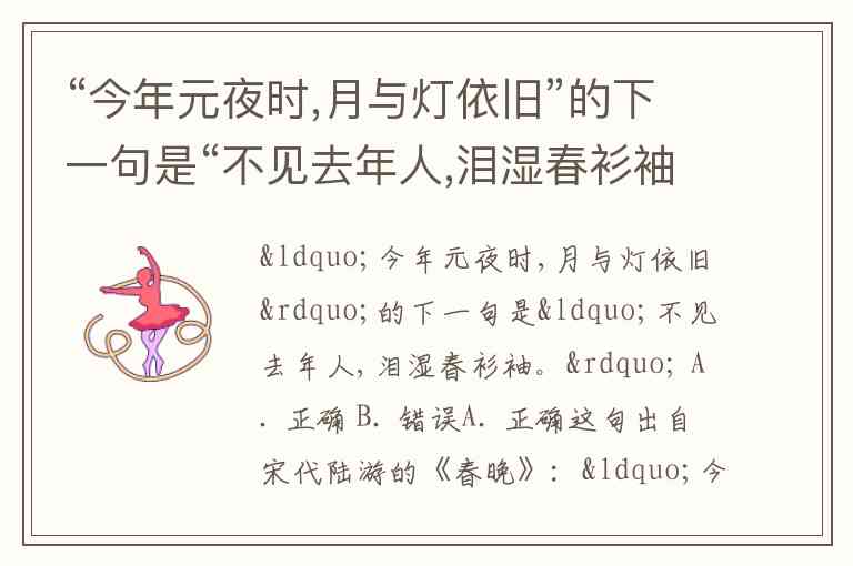 “今年元夜时,月与灯依旧”的下一句是“不见去年人,泪湿春衫袖。” A. 正确 B. 错误