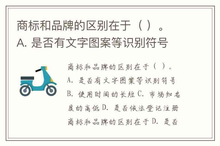 商标和品牌的区别在于( )。 A. 是否有文字图案等识别符号 B. 使用时间的长短 C. 市场知名度的高低 D. 是否依法登记注册