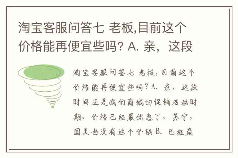 淘宝客服问答七 老板,目前这个价格能再便宜些吗? A. 亲,这段时间正是我们商城的促销活动时期,价格已经最优惠了,苏宁,国美也没有这个价钱 B. 已经最低价,不便宜了 C. 亲,这个已经是我们商城的促销价 D. 基本是没有什么问题的