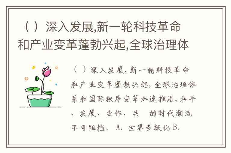( )深入发展,新一轮科技革命和产业变革蓬勃兴起,全球治理体系和国际秩序变革加速推进,和平、发展、合作、共贏的时代潮流不可阻挡。 A. 世界多极化 B. 经济全球化 C. 社会信息化 D. 文化多样化 E. 环境复杂化