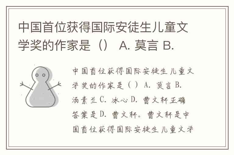 中国首位获得国际安徒生儿童文学奖的作家是() A. 莫言 B. 汤素兰 C. 冰心 D. 曹文轩