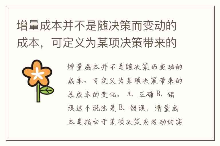 增量成本并不是随决策而变动的成本,可定义为某项决策带来的总成本的变化。 A. 正确 B. 错误