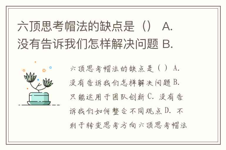 六顶思考帽法的缺点是() A. 没有告诉我们怎样解决问题 B. 只能运用于团队创新 C. 没有告诉我们如何整合不同观点 D. 不利于转变思考方向