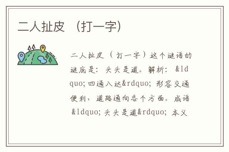 “扯皮”:“扯”本身就有“拉、撕”的意思,动作需要用手;“皮”则直接对应“批”字右边的“比”字(“比”和“皮”发音相近,有时在谜语中会借用)。因此,“二人扯皮”生动地描述了用手(扌)和“皮”相关的动作,组合成“批”字。