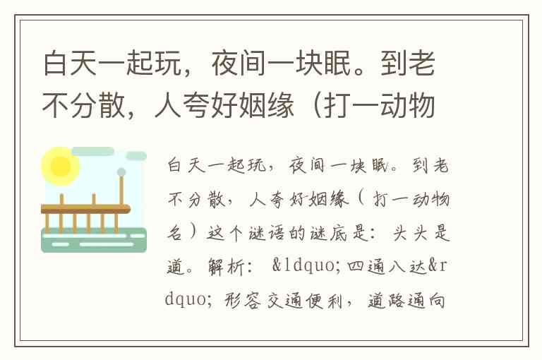 根据谜面“白天一起玩,夜间一块眠。到老不分散,人夸好姻缘”,谜底是 鸳鸯。
