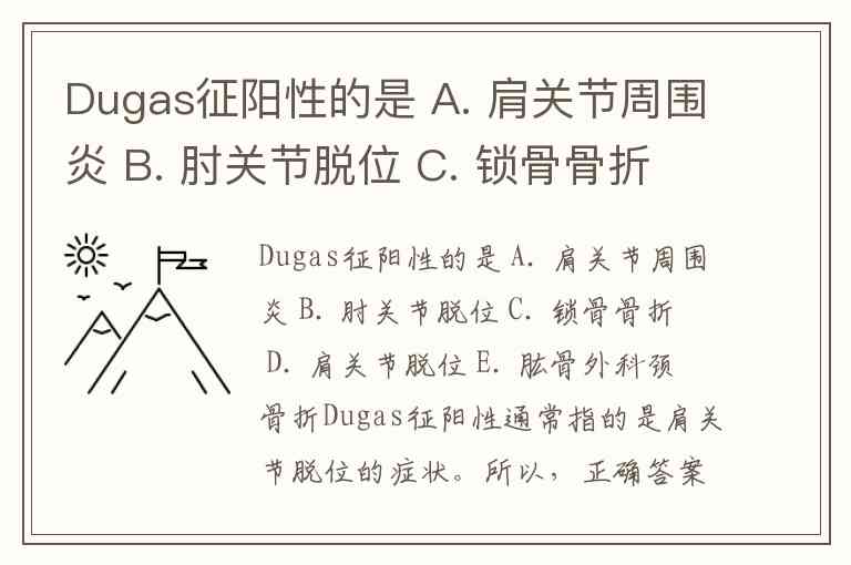 Dugas征阳性的是 A. 肩关节周围炎 B. 肘关节脱位 C. 锁骨骨折 D. 肩关节脱位 E. 肱骨外科颈骨折