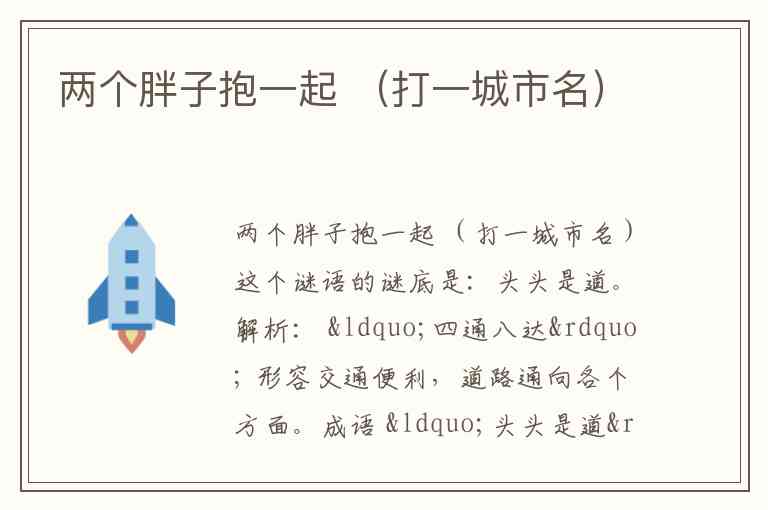 | 组合谜底 | 将两个“肥”字结合,就构成了“肥肥”。而“肥肥”的读音与安徽省省会城市“合肥”非常接近,因此谜底就是合肥。 |