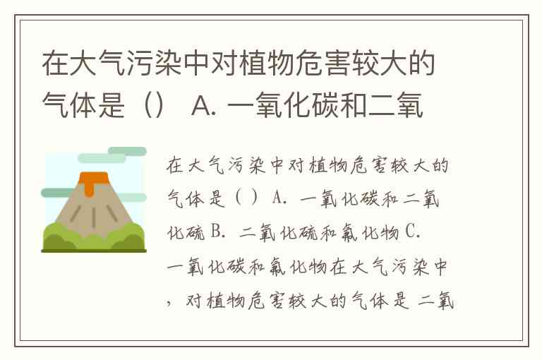 在大气污染中对植物危害较大的气体是() A. 一氧化碳和二氧化硫 B. 二氧化硫和氟化物 C. 一氧化碳和氟化物