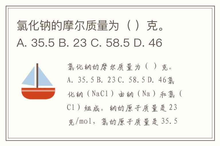 氯化钠的摩尔质量为( )克。 A. 35.5 B. 23 C. 58.5 D. 46