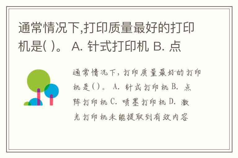 通常情况下,打印质量最好的打印机是( )。 A. 针式打印机 B. 点阵打印机 C. 喷墨打印机 D. 激光打印机