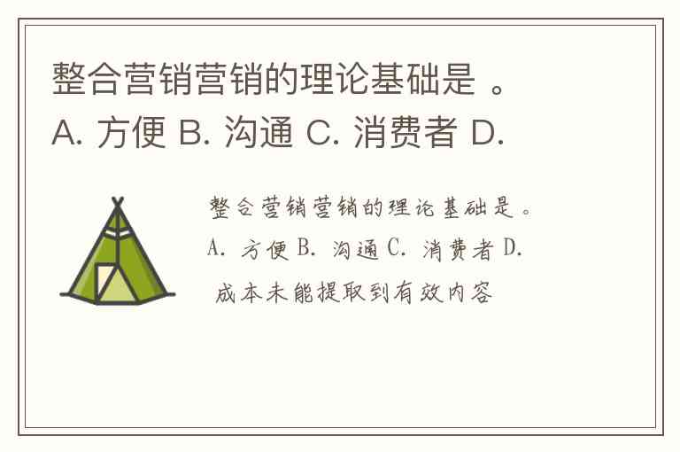 整合营销营销的理论基础是 。 A. 方便 B. 沟通 C. 消费者 D. 成本