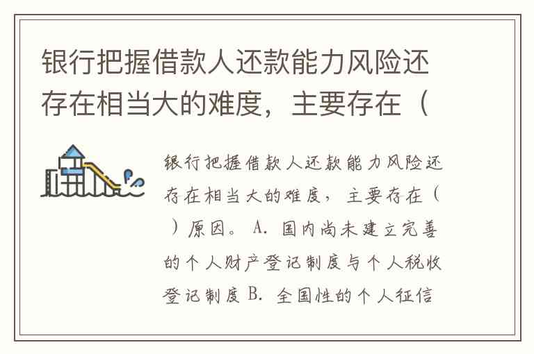 银行把握借款人还款能力风险还存在相当大的难度,主要存在( )原因。 A. 国内尚未建立完善的个人财产登记制度与个人税收登记制度 B. 全国性的个人征信系统还有待进一步完善 C. 银行很难从整体上把握借款人的资产与负债状况并作出恰当的信贷决策 D. 国内失信惩戒制度尚不完善 E. 对主动作假或协助作假的行为尚缺乏有力的惩戒措施