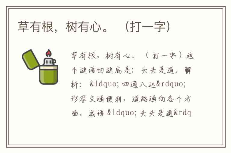 | “草有根” | “草”通常指草字头“艹”,而它的“根底”可以理解为支撑草叶的下半部分。提示中指出是“十”,这可以看作是“艹”字下半部分的抽象形状,或者代表植物的根基。 |