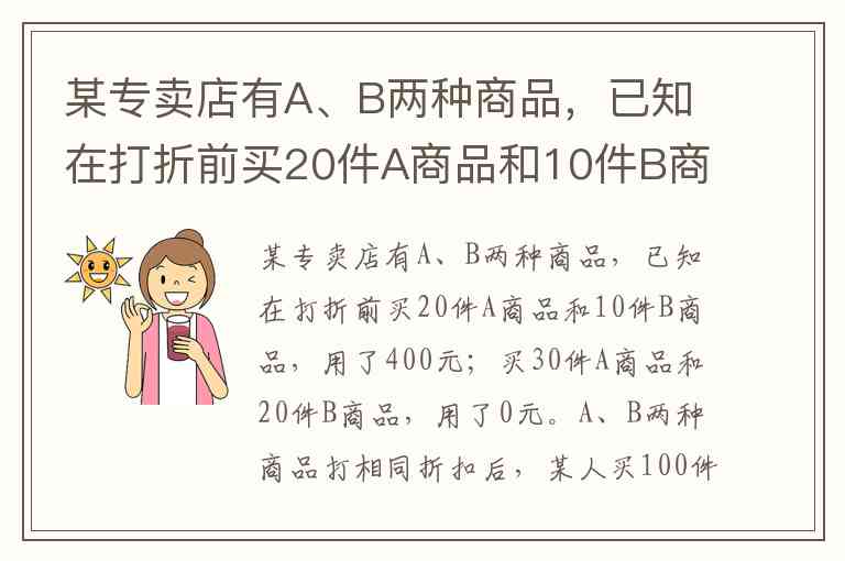 某专卖店有A、B两种商品,已知在打折前买20件A商品和10件B商品,用了400元;买30件A商品和20件B商品,用了0元。A、B两种商品打相同折扣后,某人买100件A商品和200件B商品,一共比不打折少花了0元,那么A、B两种打了多少折扣? A. 6折 B. 7折 C. 7.5折 D. 8折