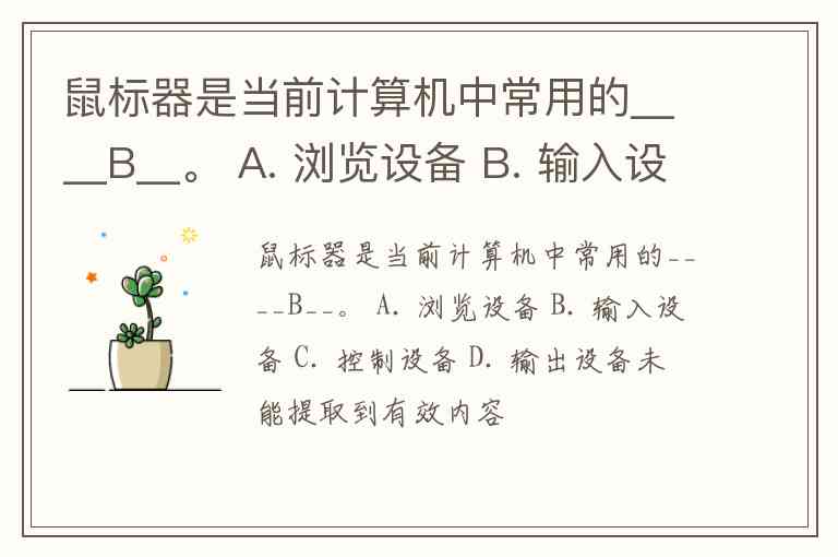 鼠标器是当前计算机中常用的____B__。 A. 浏览设备 B. 输入设备 C. 控制设备 D. 输出设备