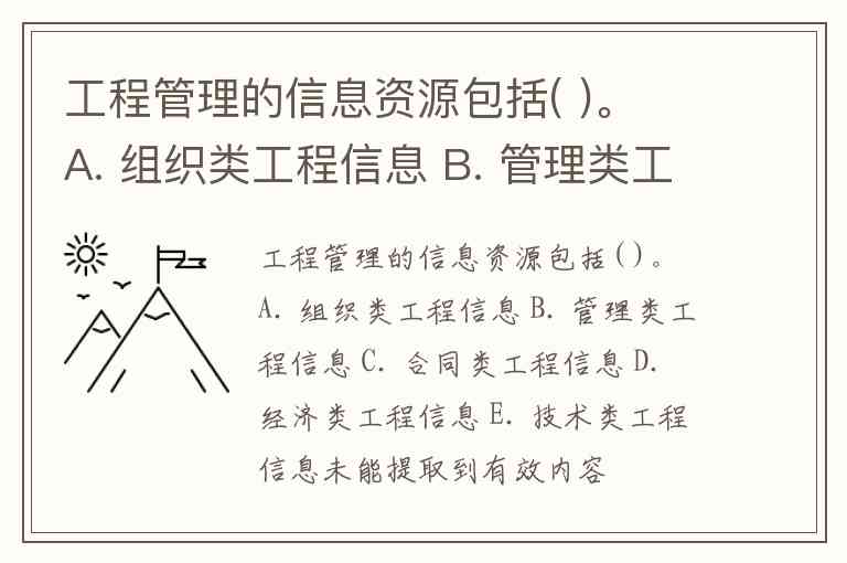 工程管理的信息资源包括( )。 A. 组织类工程信息 B. 管理类工程信息 C. 合同类工程信息 D. 经济类工程信息 E. 技术类工程信息