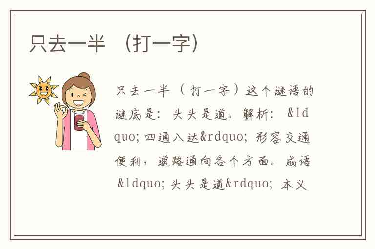 简单来说,这个谜语可以理解为:“只”字,加上“走”字的一半(足),得到的字就是“足”。这是一种通过字形叠加和暗示来解谜的常用方法。