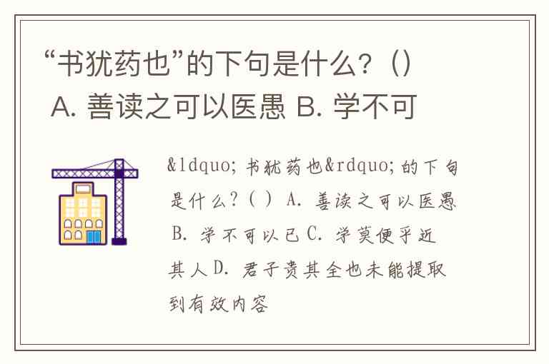 “书犹药也”的下句是什么?() A. 善读之可以医愚 B. 学不可以已 C. 学莫便乎近其人 D. 君子贵其全也
