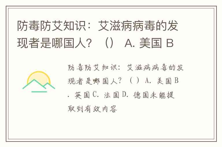 防毒防艾知识:艾滋病病毒的发现者是哪国人?() A. 美国 B. 英国 C. 法国 D. 德国