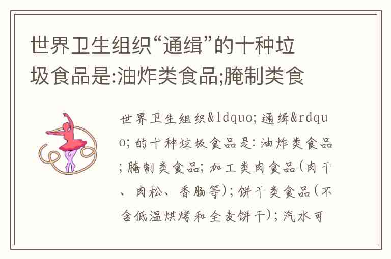 你列出的这份“世界卫生组织‘通缉’的十种垃圾食品”名单,在网络上流传已久,但世界卫生组织(WHO)官方从未正式发布过这样的名单。